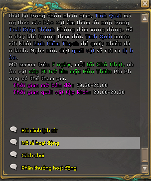 - Sẽ xuất hiện Quái Tinh Anh, Boss nhỏ. Có thông báo hệ thống trước khi ra.